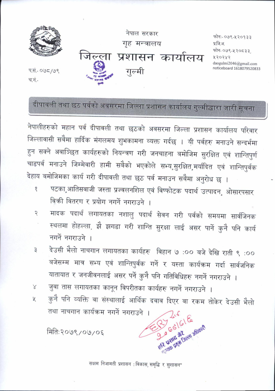 दीपावली तथा छठ पर्वको अवसरमा जिल्ला प्रशासन कार्यालय गुल्मीद्धारा जारी सूचना